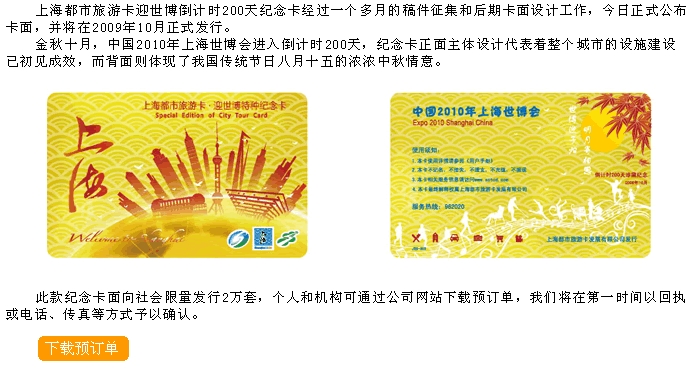 上海都市旅游卡迎世博倒计时200天纪念卡十月发行欲购从速