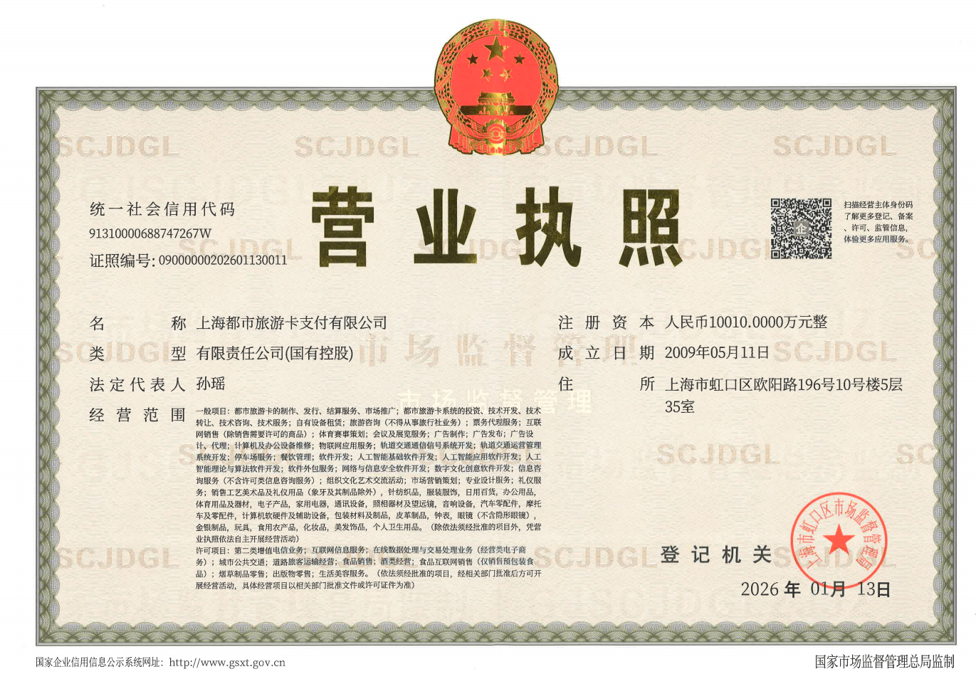 2.新公司名称:上海都市旅游卡支付有限公司。